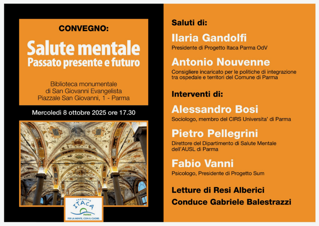 Se è vero che dal 1978, con la legge Basaglia, le persone con disturbi della salute mentale hanno riconquistato gran parte dei loro diritti, è altrettanto chiaro che c’è ancora bisogno di informazione, di parole contro lo stigma, di memoria, di narrazioni condivise. È in programma per mercoledì 8 ottobre, alle ore 17.30 alla Biblioteca monumentale di San Giovanni Evangelista il convegno “Salute mentale: passato, presente, futuro”, organizzato dall’associazione Progetto Itaca Parma nell’ambito delle iniziative promosse in tutta Italia nel mese di ottobre per la Giornata Mondiale della Salute Mentale.